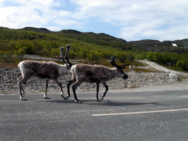 Rentiere auf der Strasse.